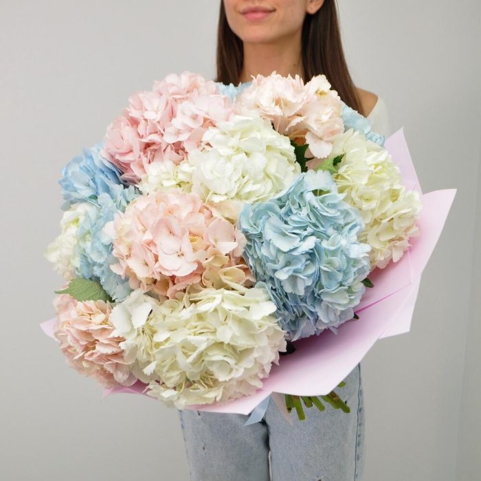 Гортензия – 15 шт.Лента атласная – 2 шт.Фоамиран (упаковка) – 2 шт.подкормка для срезанных цветов – 1 шт.инструкция по уходу за цветами – 1 шт.
