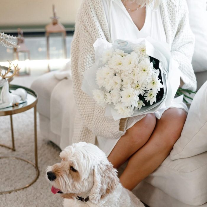 Хризантема кустовая – 5 шт.Лента атласная – 1 шт.Тишью белое – 2 шт.Упаковка корейская пленка – 1 шт.инструкция по уходу за цветами – 1 шт.крафтовый пакет – 1 шт.