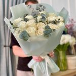 Букет белых пионовидных роз с эвкалиптом – «15 почему я тебя люблю»