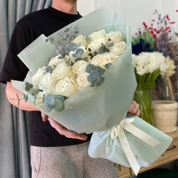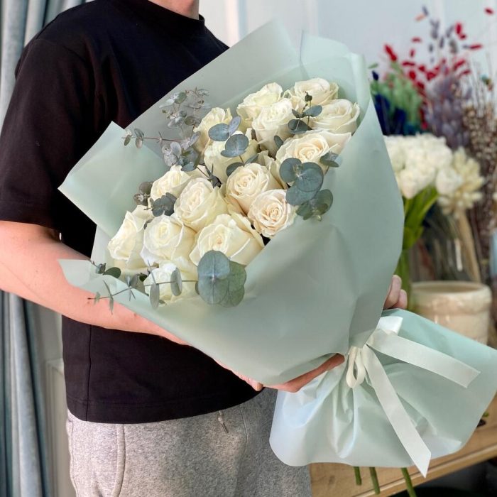 роза белая плайя бланка – 15 шт.эвкалипт 100 – 4 шт.Пленка дизайнерская – 4 шт.