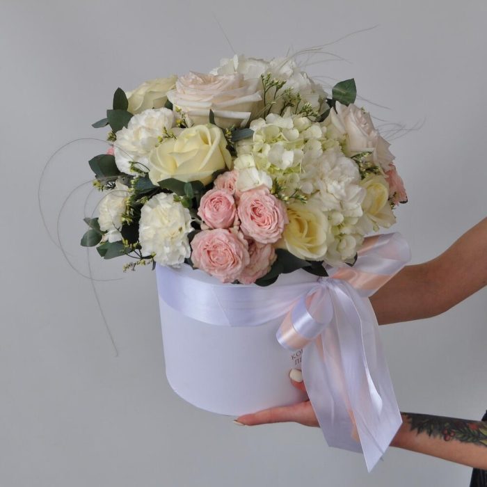 Коробка шляпная – 1 шт.Оазис флористический – 2 шт.Лента атласная – 2 шт.Гортензия белая – 2 шт.Гвоздика – 4 шт.розы кустовые пионовидные – 5 шт.Роза пионовидная – 5 шт.Роза Россия – 5 шт.Лимониум – 1 шт.Эвкалипт – 1 шт.Ковыль – 3 шт.