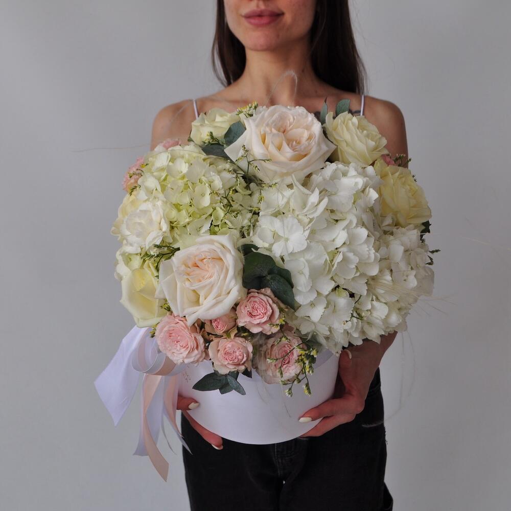 Гортензия и пионовидные розы Охара в большой коробке “Белоснежка”
