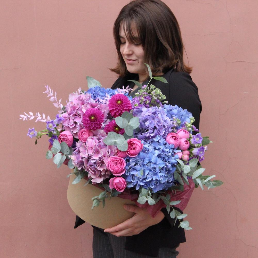 Георгина – 3 шт.Гортензия – 5 шт.Маттиола – 10 шт.Роза пионовидная кустовая – 5 шт.рускус стабилизированный – 2 шт.Эвкалипт – 10 шт.Тишью – 2 шт.Шляпная коробка – 1 шт.Оазис флористический – 2 шт.